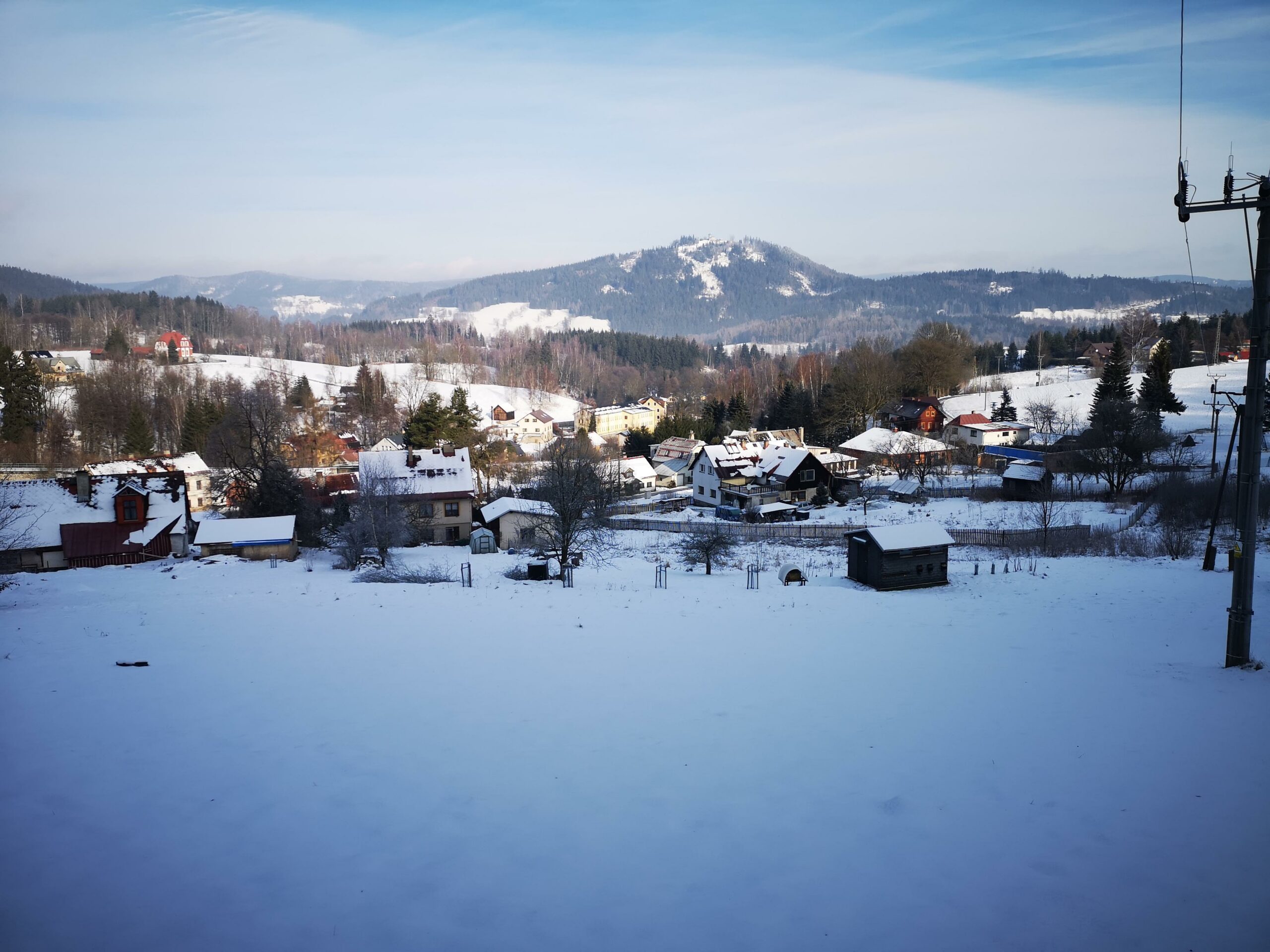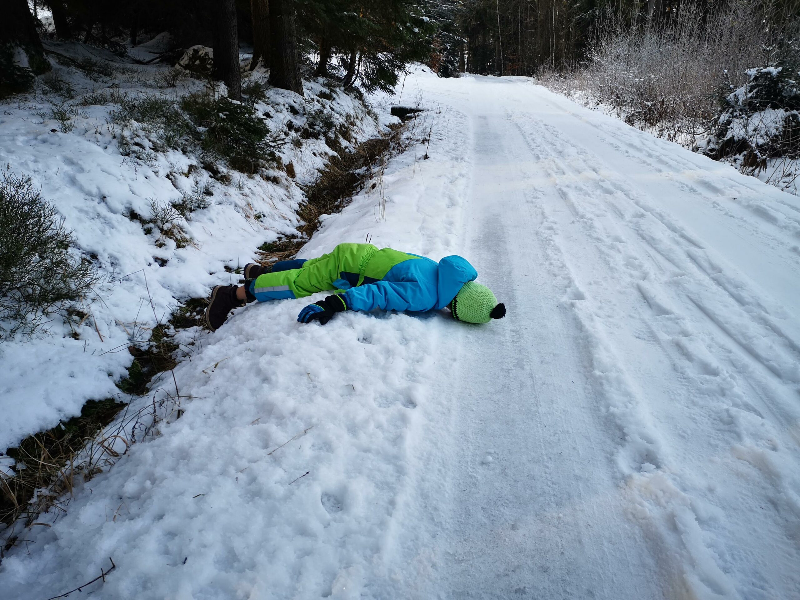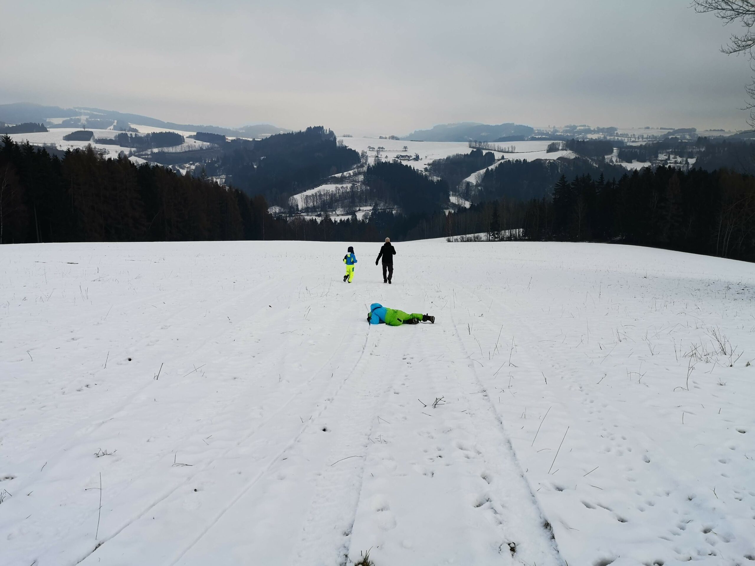 A tak jsme jeli aspoň vlakem na Smržovku a přes Černostudniční hřeben šli domů. To by nebylo, aby obě děti chtěly to stejné, takže pro změnu prudilo druhé dítě a víc se válelo po zemi, než že by šlo. Tentokrát naštěstí nikdo cestou nezamrzl jako loni Trosečník na sněhu (47), i to může být cíl.